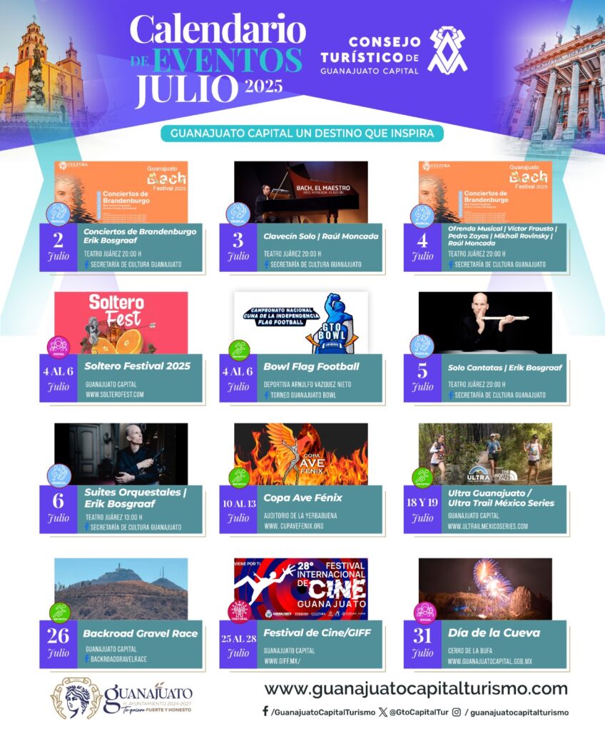 El verano llegó con fuerza a Guanajuato Capital, y julio nos regala una cartelera vibrante de eventos culturales, deportivos y artísticos que no querrás perderte. Desde conciertos en el majestuoso Teatro Juárez, hasta festivales al aire libre y competencias deportivas que llevan la adrenalina al máximo, este mes está diseñado para todos los gustos.